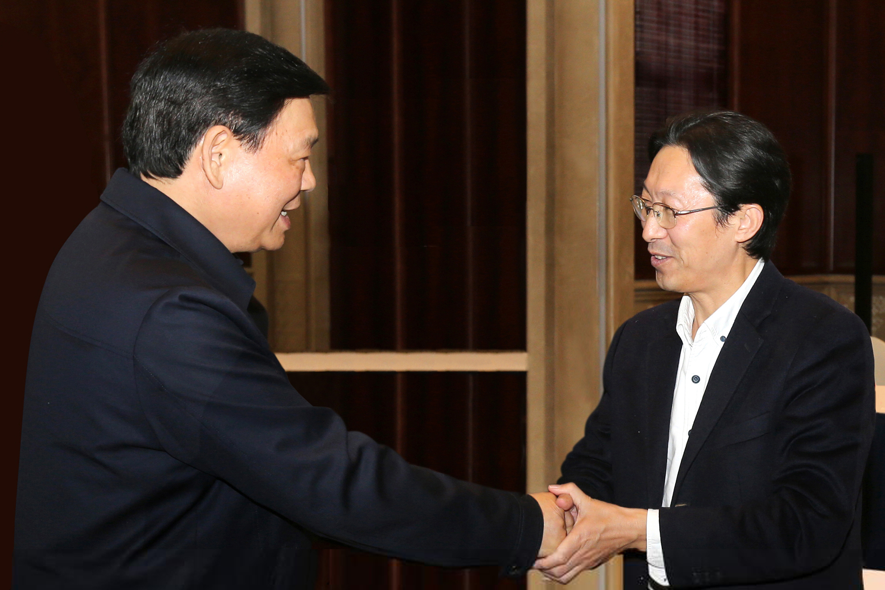 江苏省原省委书记娄勤俭(左)调研民营企业,与董事长卢明立亲切交流,对德扑之星机械创新成果与服务型制造融合发展的新模式给予高度评价。